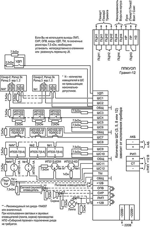 Выходы 12 В и оповещения (лампа, сирена, ОПВ) защищены от короткого замыкания.